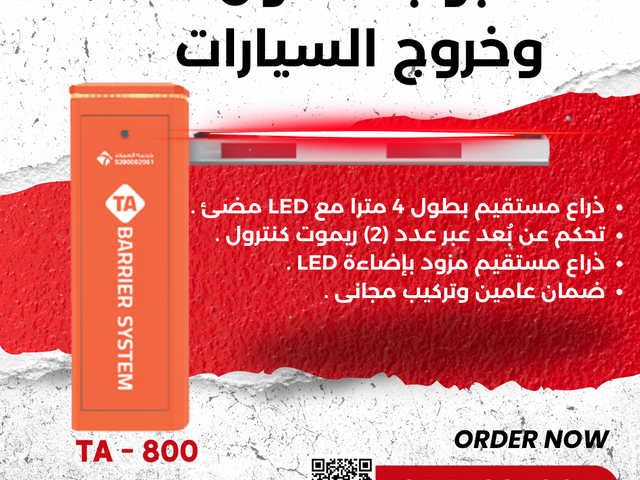اجعل منشأتك واجهة للتطور والأمان مع نظام بوابات المواقف الأكثر تطوراً، المصمم ليجمع بين قوة الأداء وجمال التصميم. ⚙️ المواصفات الفنية لموديل TA-800: ذراع متطور: ذراع مستقيم بطول 4 أمتار، مزود بإضاءة LED لضمان الرؤية الواضحة والجمالية في الوقت نفسه. تحكم كامل: يأتي النظام مع عدد (2) ريموت كنترول للتحكم عن بُعد بكل سهولة. إضاءة تنبيهية: الذراع المستقيم مجهز بالكامل بإضاءة LED تنبيهية لزيادة الأمان لي...